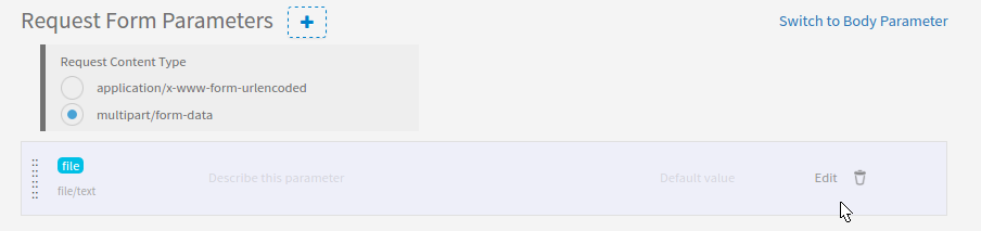 - In the right Request Body Parameter section, click Switch to Form parameters. The Request Form Parameters section is displayed.